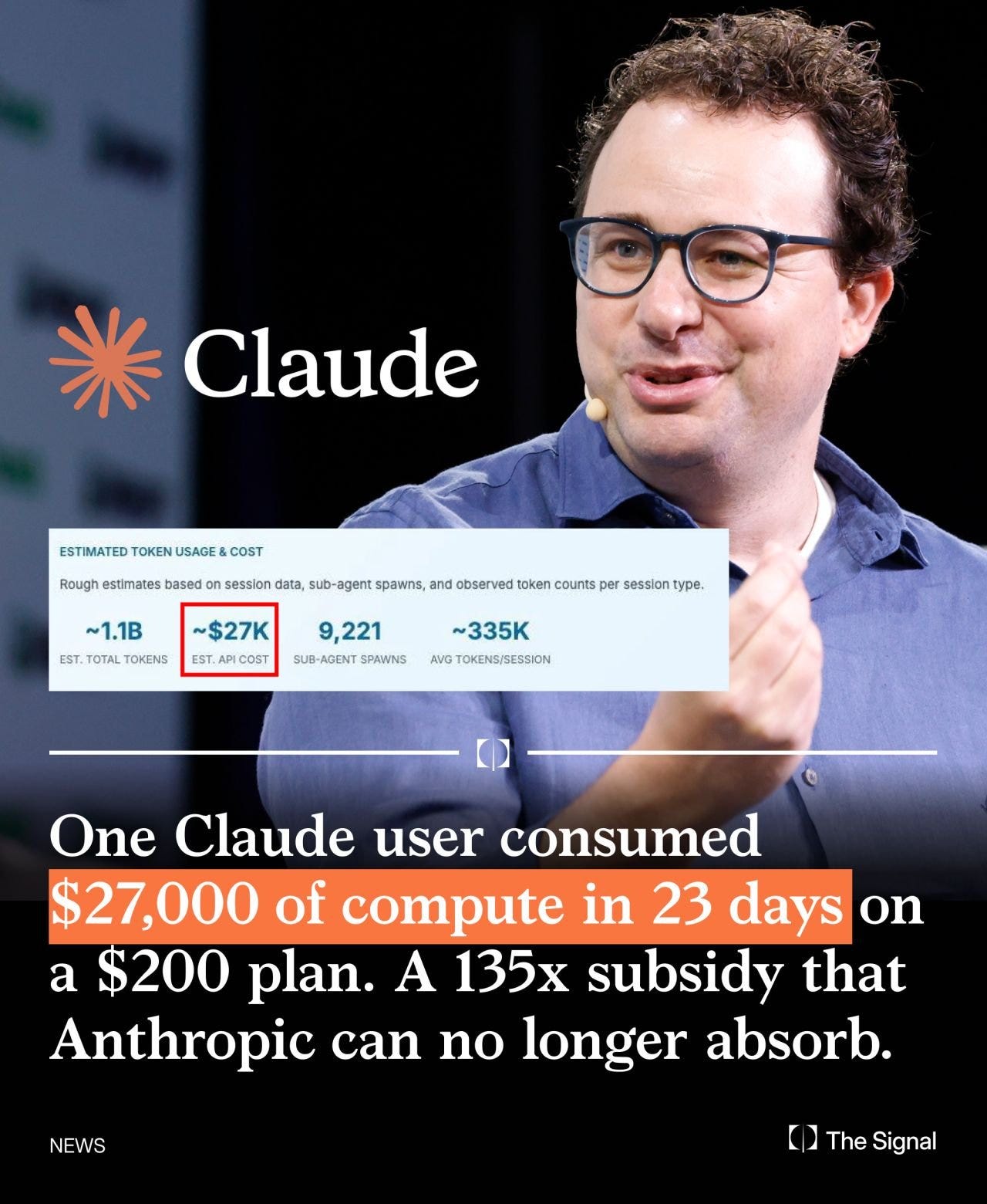 The actual compute cost of running those inferences on Anthropic’s GPU clusters was $27,000. Anthropic took a 135x loss on a single customer in less than a month.
